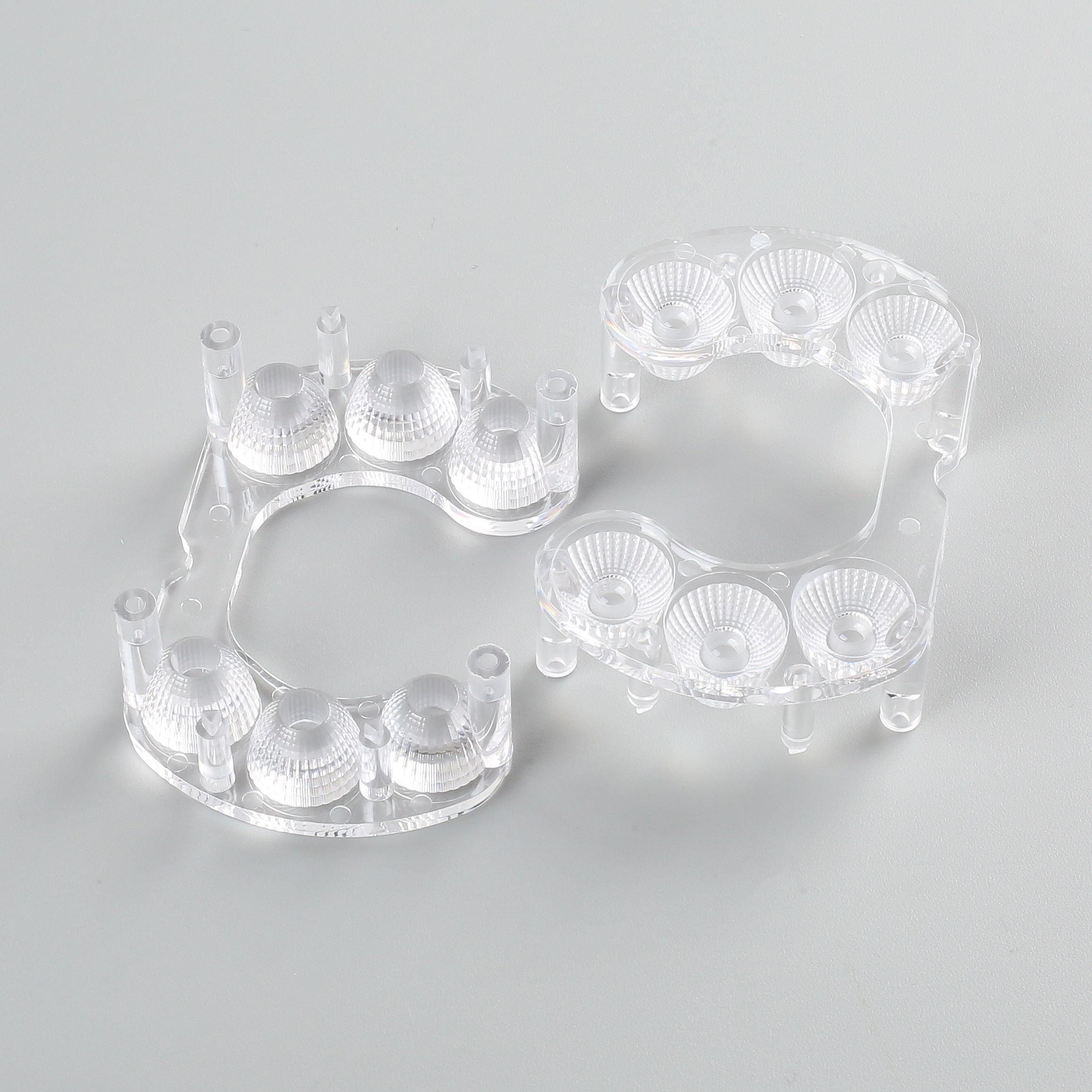 1.产品描述:出光区为磷面,光斑均匀, 非出光区为砂面,底部有4根柱子用于固定在灯板上;长的四根柱子直接可以替代铜柱。